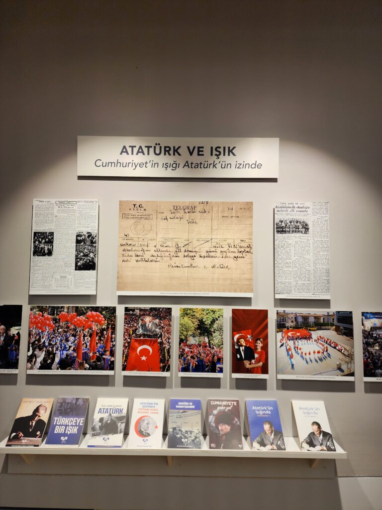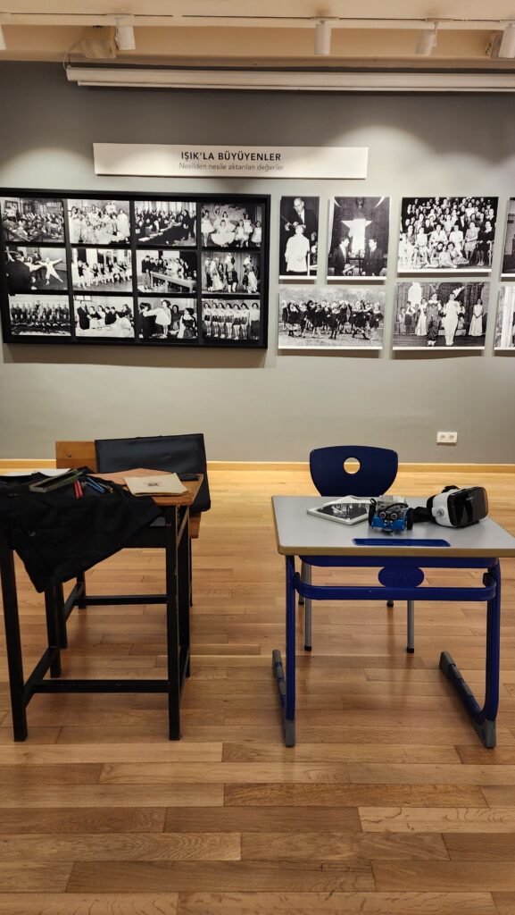 Sergide, Cumhuriyet’in ilk yıllarında kullanılan okul sıraları, ders araç gereçleri ve eğitim materyalleri ile günümüzün çağdaş sınıf donanımları yan yana sergilenerek, eğitim anlayışındaki dönüşüm somut biçimde gözler önüne seriliyor. Erken dönem öğrenci defterleri, karneler, sınıf fotoğrafları, öğretmen ve öğrenci portreleri ile dijital eğitim araçlarının birlikte sunulduğu bu seçki, geçmişle bugünü buluşturan güçlü bir eğitim hafızası oluşturuyor.