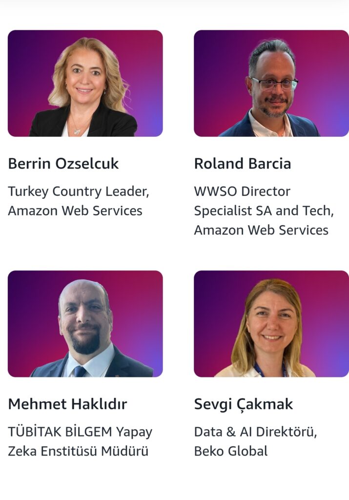 Öne çıkan konuşmacılar arasında AWS Türkiye Ülke Lideri Berrin Özselçuk, AWS WWSO Direktörü Roland Barcia, TÜBİTAK BİLGEM Yapay Zeka Enstitüsü Müdürü Mehmet Haklıdır ve Beko Global Veri & Yapay Zeka Direktörü Sevgi Çakmak yer aldı. Katılımcılar, bu uzmanların vizyoner sunumları ve paylaştıkları değerli bilgiler sayesinde bulut teknolojilerinin iş dünyasındaki rolünü daha iyi anlama imkânı buldu.