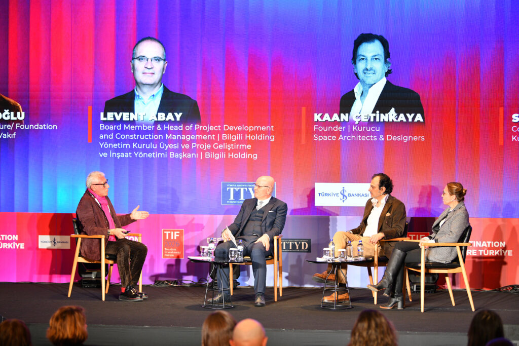 GAD Architecture/ Foundation Kurucusu Gökhan Avcıoğlu moderatörlüğünde düzenlenen “Otel Tasarımında Trendler: Destinasyon, Ruh, Deneyim ve İşlev” başlıklı oturumda, Bilgili Holding Yönetim Kurulu Üyesi ve Proje Geliştirme ve İnşaat Yönetimi Grubu Başkanı Levent Abay, Space Architects & Designers Kurucusu Kaan Çetinkaya ile Autoban Kurucu Ortağı Seyhan Özdemir, yapı tasarımının inceliklerini ve turizm deneyimine katkısını ele aldı. Panelde 20 otel, 25 bin oda kapasitesi ve 75 bin metrekarelik bir kongre merkezine sahip, kongre, spor ve longevity üzerinden turizmi 12 aya yayacak bir Konaklı projesinin dahi bölgeye 1,2 milyar dolarlık katma değer sağlayacağının vurgulandığı panelde, projelerin çok titiz çalışma ve 365 derecelik bir hassasiyetle tasarlanması gerektiği belirtildi.