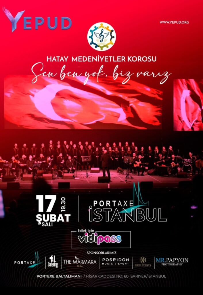 Yepud öncülüğünde düzenlenen Hatay Medeniyetler Korosu Konseri, İstanbul’un seçkin etkinlik mekânlarından Portaxe’da gerçekleştirildi. 6 Şubat depremlerinin ardından Hatay’a destek amacıyla organize edilen gece, sanat ve dayanışmayı aynı çatı altında buluşturdu.